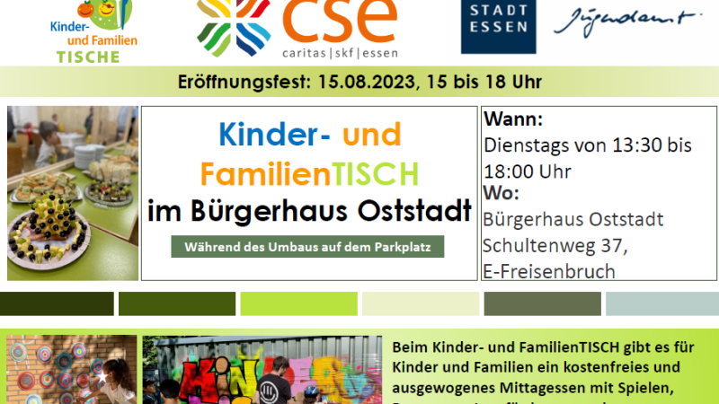 Alle Kinder und Familien sind am 15. August herzlich zum Eröffnungsfest des neuen Standortes unserer Kinder- und FamilienTISCHe in Freisenbruch eingeladen